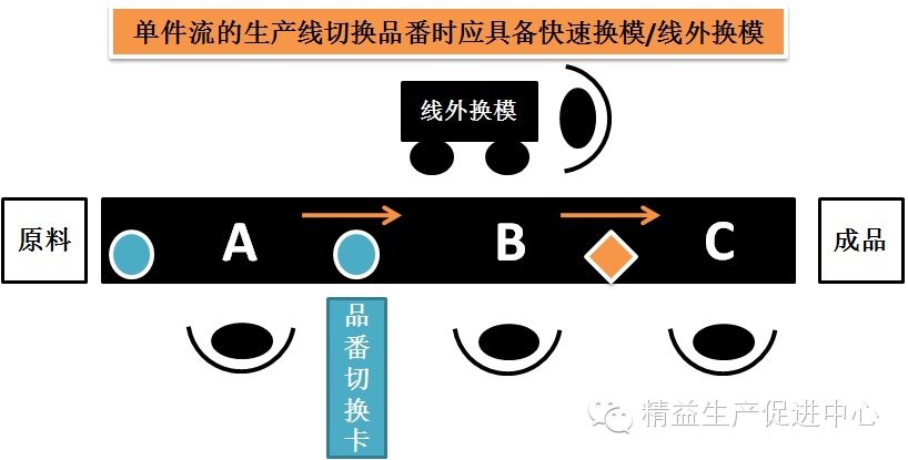 3 在实现单件流时,在同一台设备上加工不同的品种零件的快速换装和快速转移是最基本的条件。但是连续的流动和各工序之间刚刚好衔接是单件流更本质的特征。