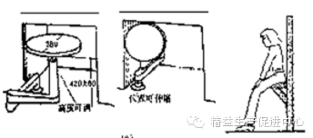 立姿工作易疲劳,条件允许时,应提供临时座位供作业者工间短时休息。临时座位不应影响立姿作业自由走动和操作。下图分别是摇动旋转式和回跳式临时座位。
