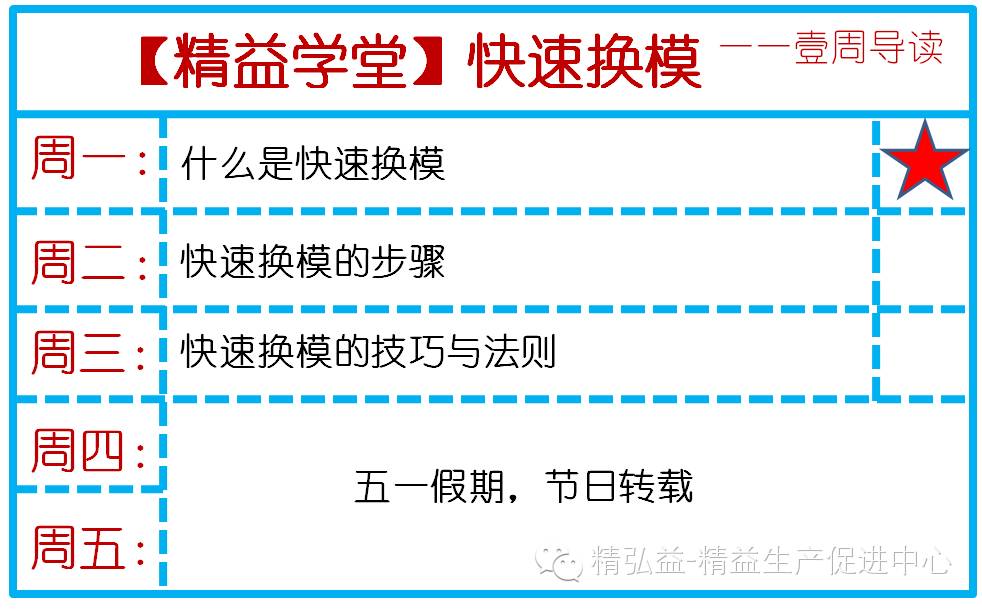 1. 换模:任何因产品更换,而必须使机器或生产线停止生产,以从事更换动作皆是。又称为设置.