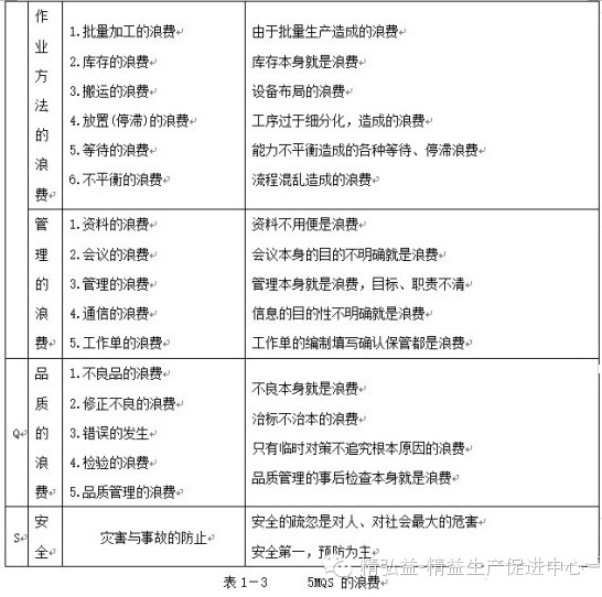 5MQS的浪费”是将浪费分5个M和Q、S等共7项进行分类的方法。5M指人(Man)、机(Machine)、料(Material)、法(Method)以及管理(Management),Q是品质(Quality),S是生产的根本即“安全”(Safety)。表1-3是关于这些浪费的一览表。