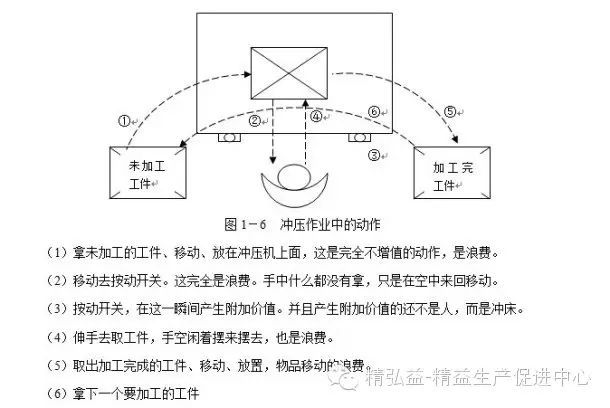 “工作”指产生附加价值的作业,那“搬运”就是浪费。并不是每个人都能将“搬运”和“工作”清楚的区分开来。况且经常是两种情形交叉存在的,有时候它是“搬运”,有时它却又变成了“工作”,“不知道浪费是什么”,这是最大的问题,也是浪费的根源。其实“搬运”和“工作”的含义完全不同。“搬运”是提高成本吞噬利润的项目,是浪费,“工作”是提高产品价值的项目。在现场两者是并存的,可怕的是浪费总是占工作的很大比例,增值的只占一点点而已。我们举一个冲压作业的例子(图1-6)。