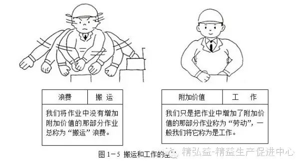 生产现场多数人用“流汗”多少来评价工作的价值,只要一流汗多,就给别人好好工作的感觉。相反也有人是用“附加价值”即劳动成果的大小来衡量劳动价值的。我们发现让人流汗的作业多半是“搬运”等不赚钱的事情,“搬运”与“工作”是不同的,从1天的工作时间分析看,如果把作业员每天8小时的作业全部看作是“工作”,那是不对的,因为实际8小时的绝大部分作业是“搬运”。图1-5区分了这部分内涵的差异。