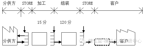 1. 绘制不仅针对对象工序,更要能显示从客户到分供方的各工序间的联系,所以需要从左到右表示物品的流程(客户在图右侧),在图标上方还要做适当标示以让人明白是哪一工序。《例示》