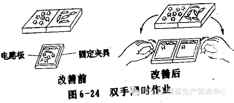 人们经常用一只手代替万用夹钳等夹具握持工件,结果造成动作浪费。因此应经常注意到在作业中同时使用双手动作,同时要改善作业现场和工夹具,以便于双手同时作业。