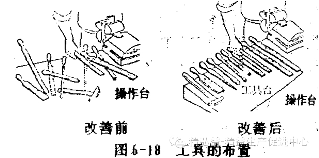 把工具物料放在操作者前面的固定位置处:避免寻找,弯腰,过渡伸手等动作。熟练到一定程度后可以达到无意识伸手即能抓取物件。