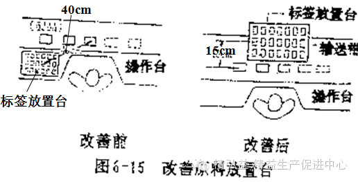 改善前操作者从左侧取标签,必须转身。改善方案将标签放置台改在操作者前面,伸手即可去标签,移动距离由40cm缩短为15cm。
