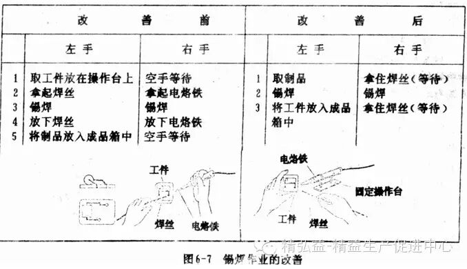 改善前电烙铁位置没有固定,由右手握持,一个作业需要5个动作。改善方案为固定电烙铁的位置,动作数由5个减少为3个。