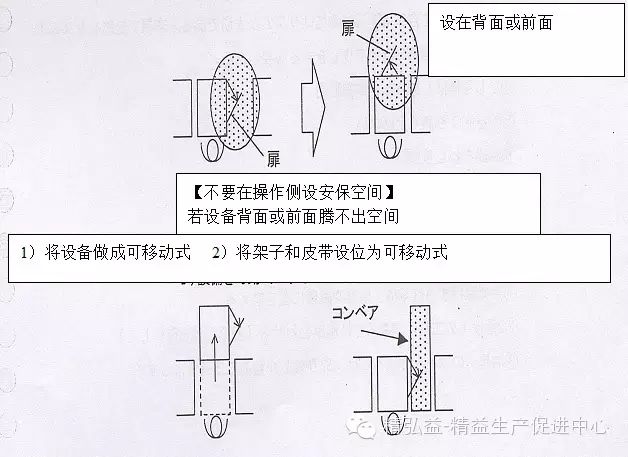 为了减少操作工步行的浪费,要设计宽度窄的设备。特别是要尽量设计成附带机器不会增加线体宽度的布局,要将安保空间尽量设计在设备的前面或背面,不要在操作侧弄出不必要的空间。