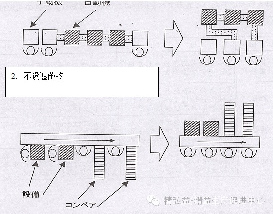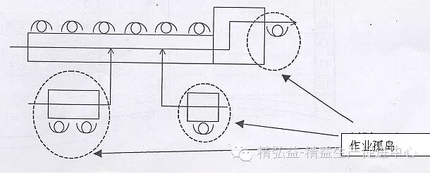 在生产量发生变化时,最防碍少人化的就是“作业孤岛”。如果出现“作业孤岛”,要改变线体内的人数就很困难。若按照固定节拍生产,就一定出现工人等着工作的状况,会降低人的工作效率。(所谓作业孤岛)指的是偏离设备布局的工位