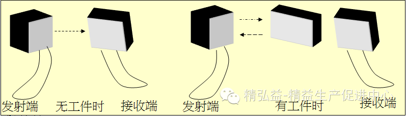 当无工件时, 光线由发射端直接射入接收端, 传感器无输出, 当工件处于传感器的发射端和接收端之间时, 工件遮住了光线, 接收端输出信号。