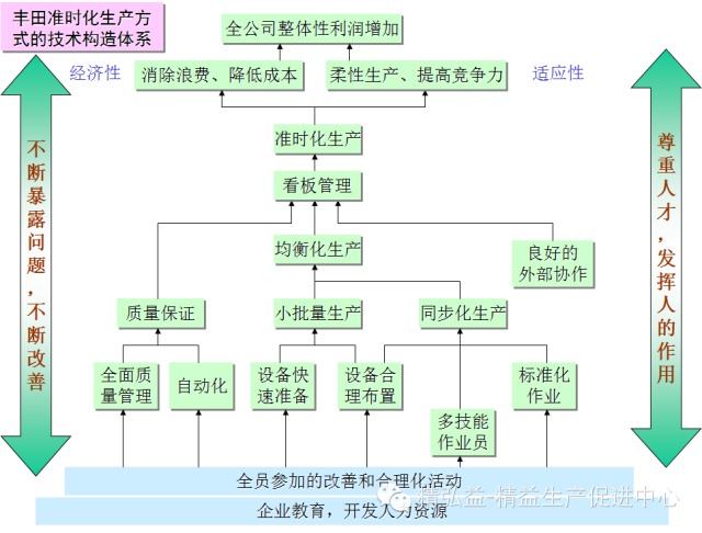 附图明确而简洁地表示了丰田准时化生产方式的体系构造,同时也表明了该体系的目标以及实现目标的各种技术、手段和方法及其相互间的关系。