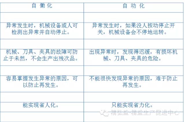 自働化:当品质或设备有异常发生时,设备或生产线具有自动停止或作业员主动使之停止的能力。在这里强调的自働化是带人字旁的动。