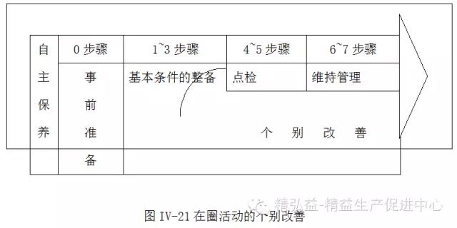 由于个别改善为呈现每个人的改善意愿与降低损失达成显著成果的活动,因此,如图IV-21从自主保养活动的第2步骤开始,完成选定主题的工作。至于在准备阶段应选定何种主题?则须于决定收集何种资料等,因此在第2步骤以前确实掌握现状,明确问题点,透过第2步骤进行改善,然后持续地推行改善工作。