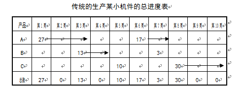 改变每周投产的产品混合组的结构,使得每个品种每周都生产一些。按下表所示,改变进度表后,各种产品每周都安排生产一些,因此,急需零部件A的总装厂就有较大的希望及时得到它。