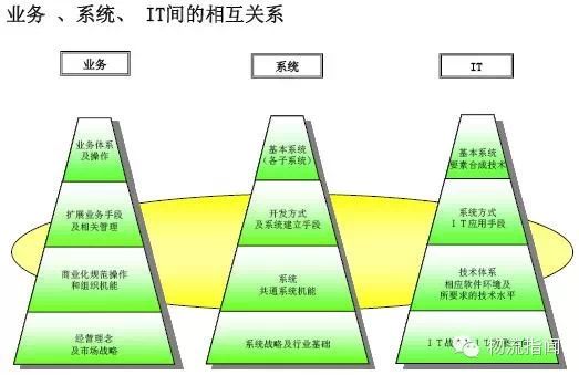 下图所示为业务、系统、IT的横向关联以及对从战略到运营、具体要素的四个纵轴进行整理后的联动模式。