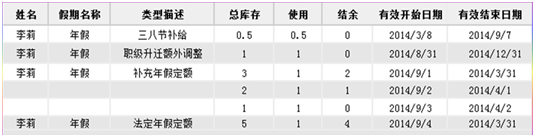 精细化假期动态管理,诸如“年假”因升迁、调岗临时产生的库存调整进行逐条“有效期”管理,员工使用过程中不仅可便捷的查询各时间段内可用库存数。带薪假期的动态管理不仅完善了企业休假福利体系,通过透明化的管理模式也减少了员工与人资部门的纠纷,提升了员工对企业的满意度。