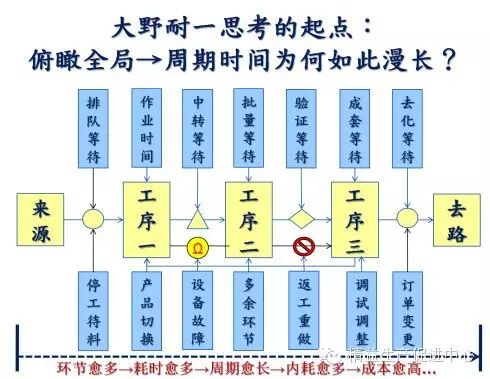 为了缩短生产周期时间,大野耐一便开始着手分析整个生产过程的时间流失情况,发现大部份的时间都是在各种等待中流失掉的,所以在早期(1952年以前),清除各种等待时间便成为其最主要的攻关课题。