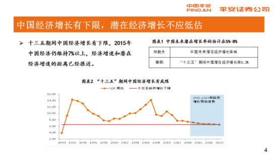 2015年中国经济最后一次见到7%的增长,也许告别2015年之后,我们很难再见到7%或者高于7%的增长,那是不是意味着中国经济特别悲观呢?不是的。从2016年差不多到2020年,中国的平均经济增速仍然有6.5%到7%之间,这是多方面因素制约的。