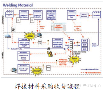 其次,根据精益生产原则,描绘此生产环节中物料消耗的现状价值流图。并以此分析生产过程中物料流转的信息流和物流及瓶颈环节,做到有针对性地开展精益工作。如图: