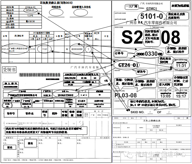 供应商交付产品的所有信息(包含物流信息)都一目了然地体现在按GTMC的要求准备好的《受领书》中,《受领书》包括便次号,订单号,托数量,EU箱及产品的品种、数量等信息,在托看板上可以醒目地看出订单号、托数量和托序号,由供应商和司机共同确认托信息,并在受领书上签名(供应商负责用叉车进行整托装卸作业,因为平准化的生产计划,卸、装的托数量相同,零部件以托为单元交付,仅需确认托信息即可,交接时间非常短),成为双方的交接依据。实际运行中,为了确保零部件和空器具的安全,不丢失,GTMC使用铅封的改善方案,以便供应商、司机快速交接,集货全过程需要开、闭飞翼的场合都需要供应商确认铅封,并填写《卡车上锁确认表》(本文不表述铅封的操作),此举司机不但理解而且完全接受,因为只要铅封完好,司机的工作就能非常顺畅。DCS表、受领书、托看板和卡车上锁确认表及确认内容参考图5。