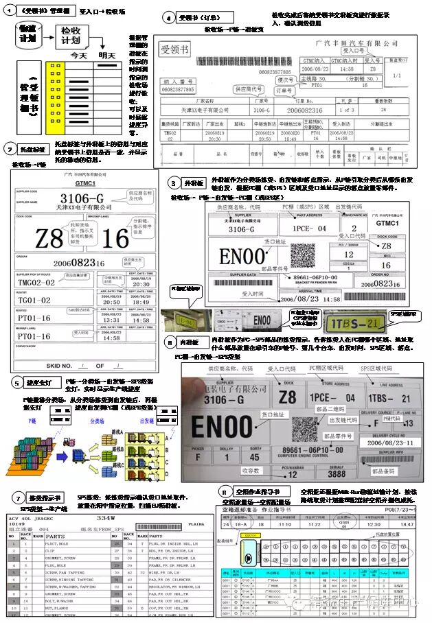 (1)零部件从巡回取货国产LP零件(天津、上海等远距离供应商)及KD零件到货后进入P链(Progress Lane,P-Lane,进度吸收链)、PC棚(Production Control Rack,安全在库放置场所),再按生产进度指示(安灯、看板)配送到SPS(set parts supply,对装配线成套供给零部件)区。