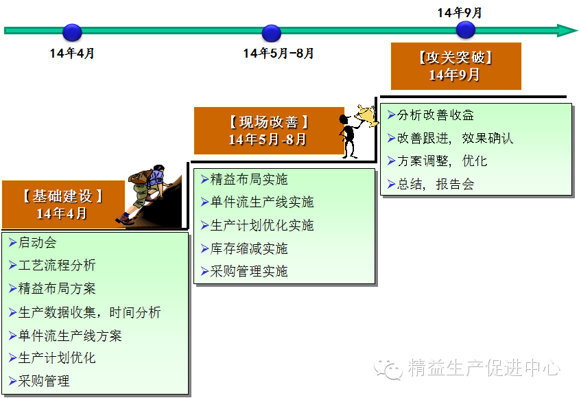 尽管对于实施精益的步骤达成越来越多的共识,大致按下列次序: 教育培训 ;商业评估 ;目标设定 ;价值流图分析 ;5S ;变革管理 ;改进团队采用精益工具实施改善